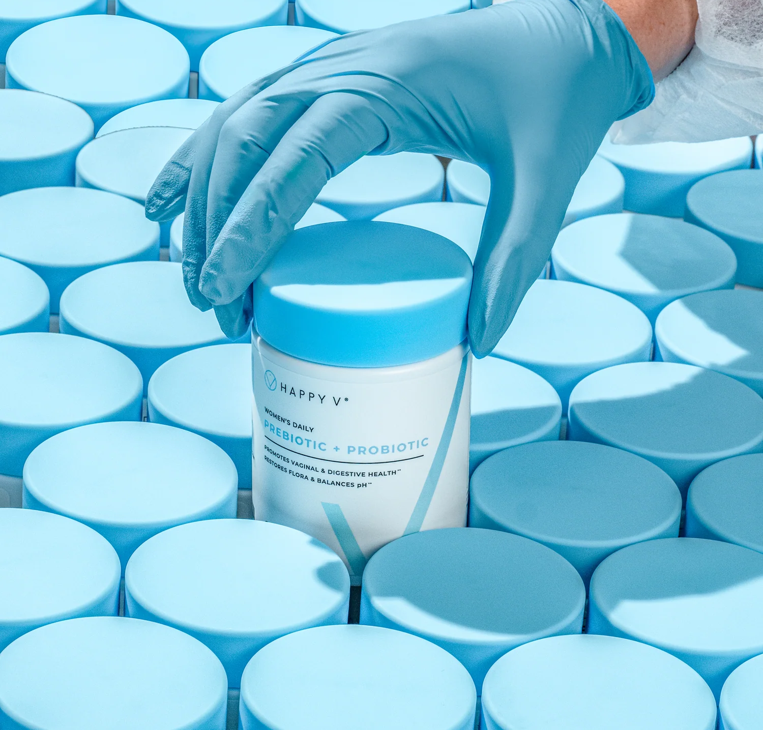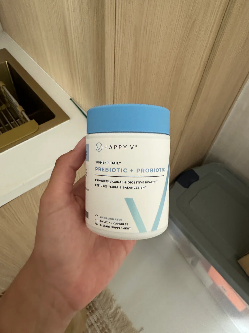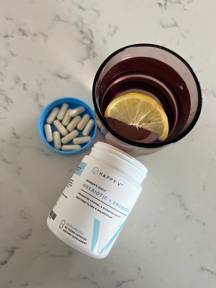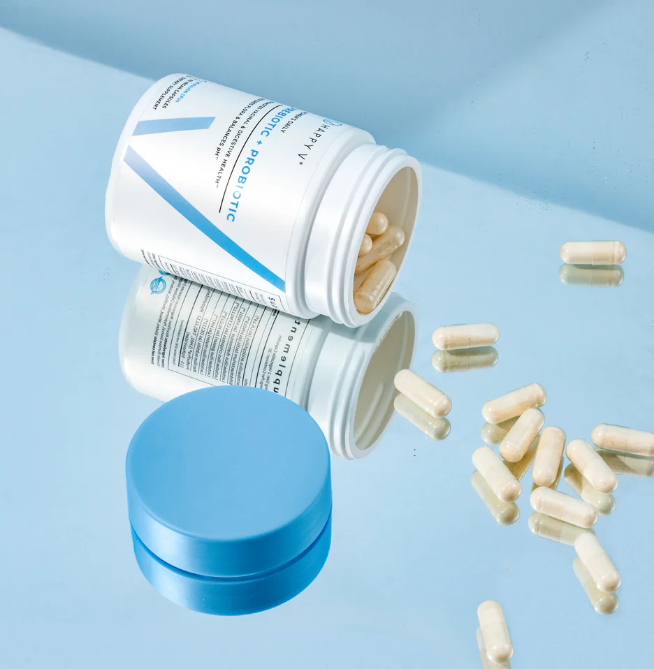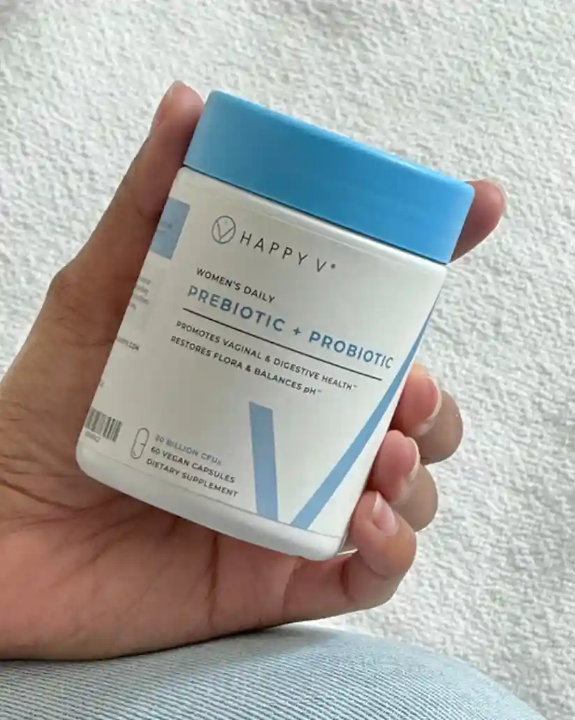 Happy V® Prebiotic + Probiotic is a daily supplement designed to support the vaginal, gut, and immune microbiomes. It combines 7 clinically-studied probiotic strains with a patented, non-fiber prebiotic (PreforPro®) to help maintain a healthy microbial balance – especially in women prone to imbalances like bacterial vaginosis (BV) or yeast infections.*